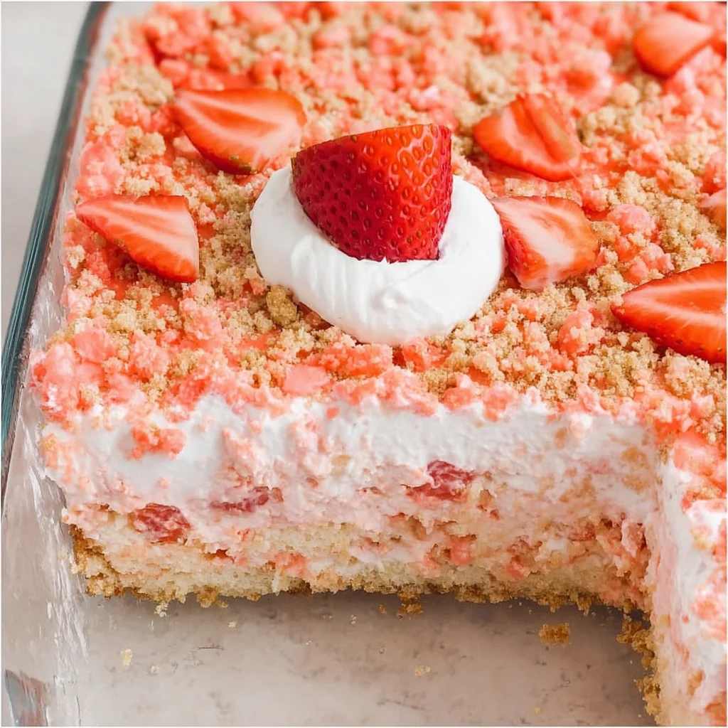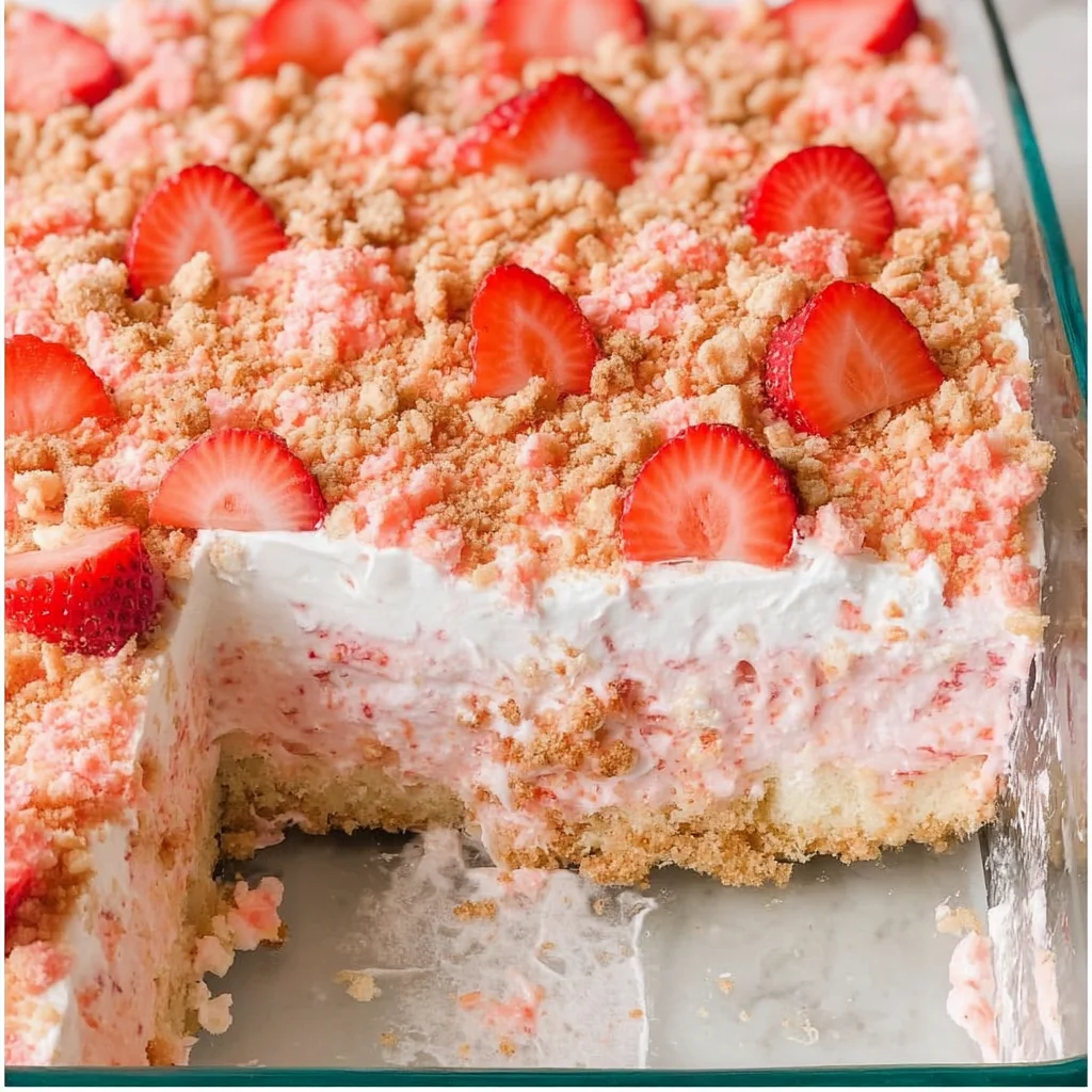 This isn’t just a cake; it’s a trip down memory lane in every single bite. It’s moist, it’s creamy, it’s bursting with strawberry flavor, and it has that iconic crunchy topping that just makes you smile. Plus, and here’s the best part, it’s ridiculously easy to make. Seriously, if you can bake a simple cake mix, you can make this showstopper. It’s perfect for potlucks, birthdays, holidays, or just because you need a little dose of happy in your day. Let’s bake some magic!