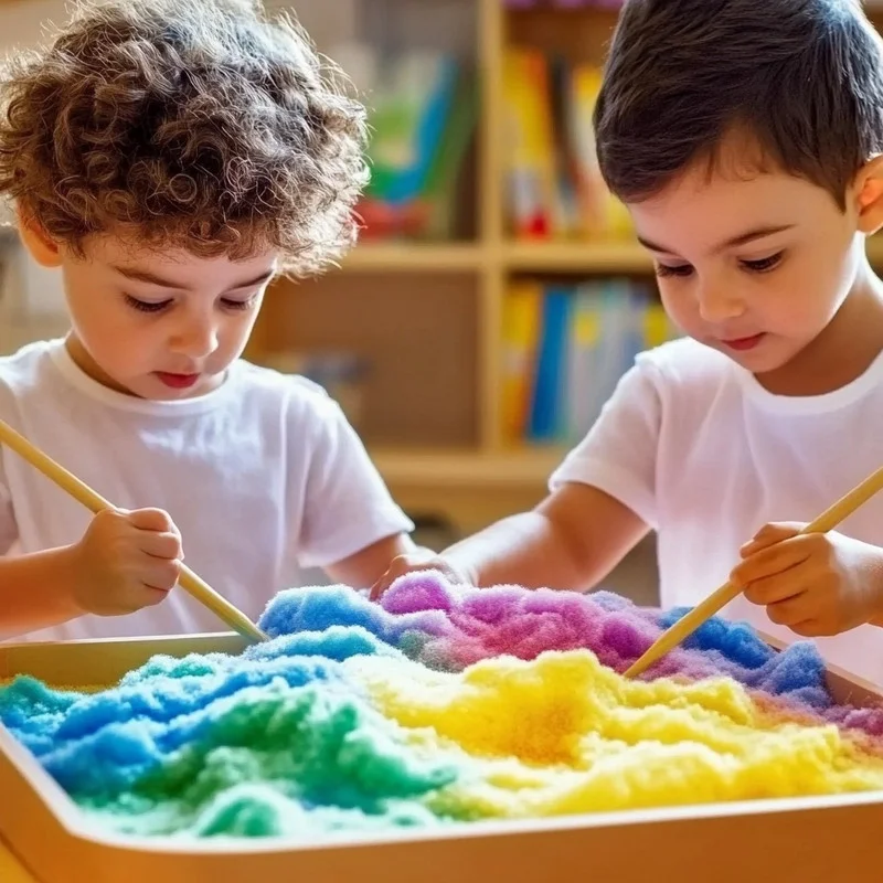 Now, carefully scoop the colored foam into your art tray. Get creative here! You can arrange the colors in a perfect rainbow order, from red to purple, or swirl them together for a more abstract, marbled effect. The sky’s the limit with how you want to lay out your colorful masterpiece!