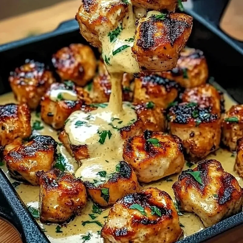 - Time to serve! Arrange your perfectly grilled chicken bites on a platter. You can be fancy and drizzle the creamy garlic sauce generously right over the top, or serve the sauce on the side in a little bowl for dipping. Trust me, either way, these will disappear in a flash!